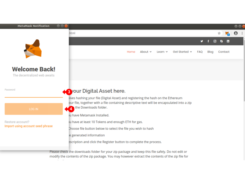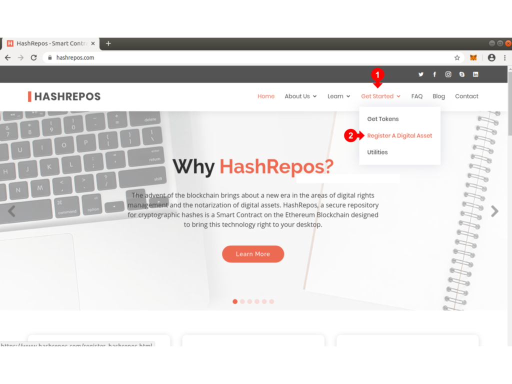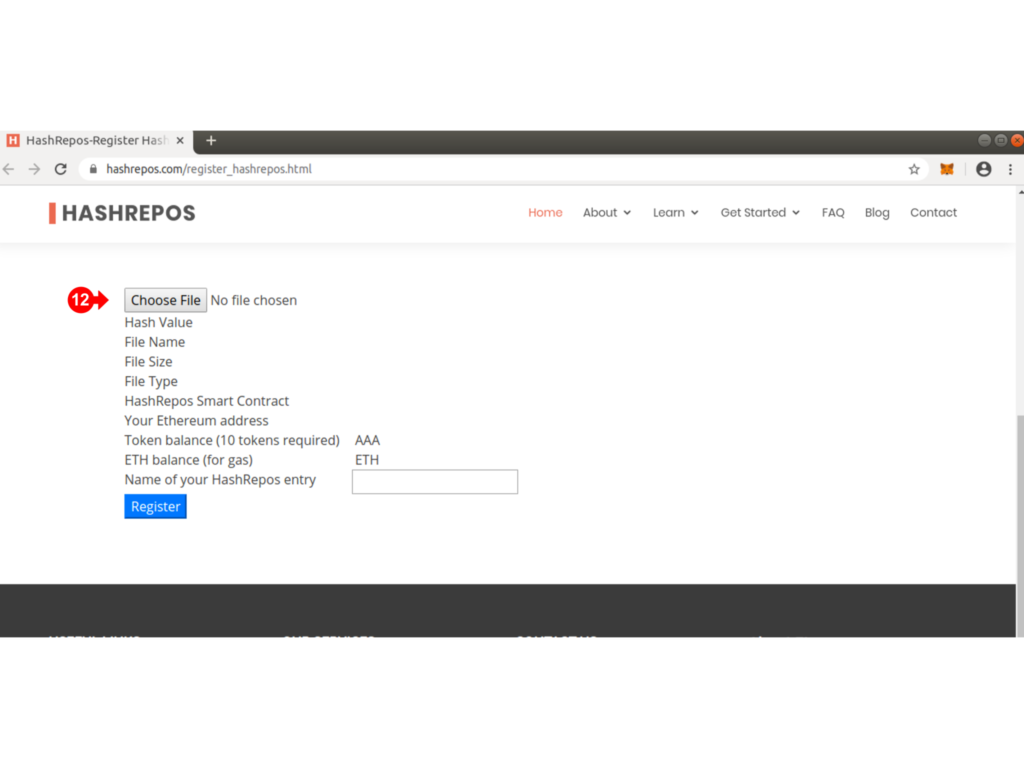 Once you have your Metamask Wallet set up with some ETH and have purchased some Tokens, you are ready to use HashRepos to register a hash of your file.