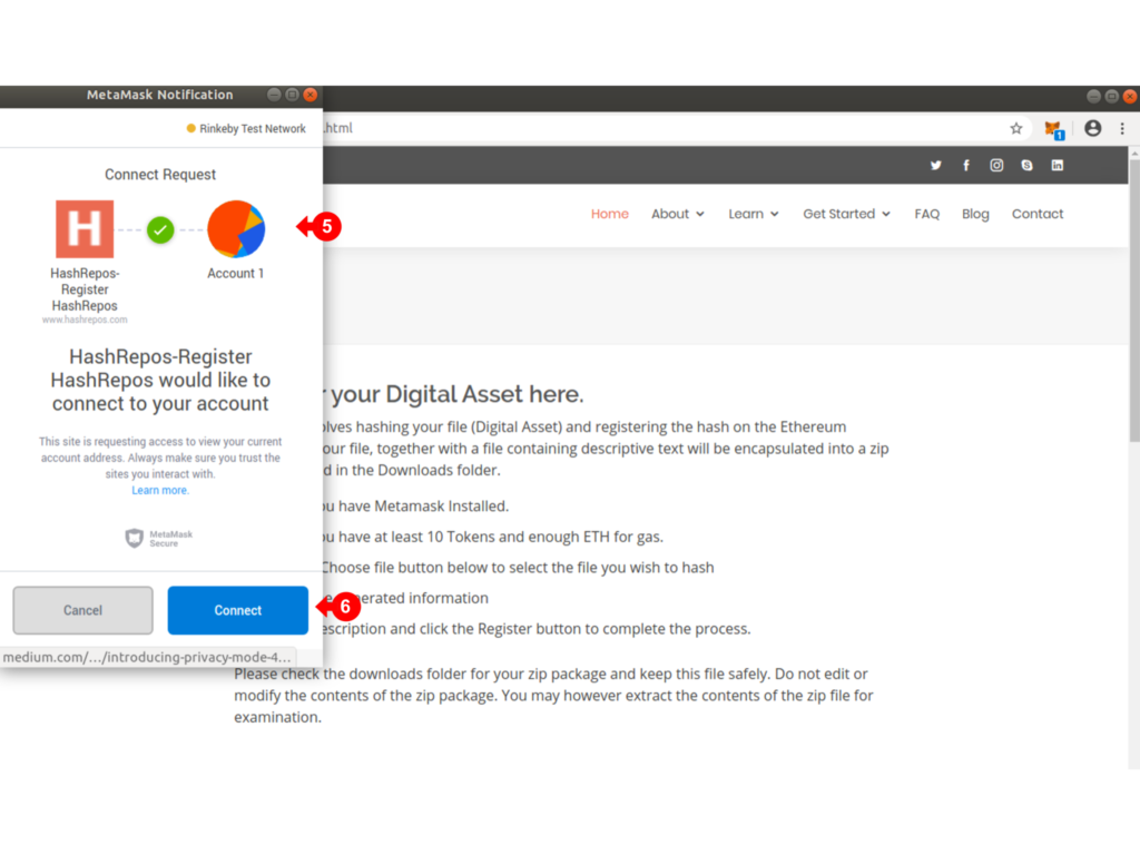 You will be asked to confirm the Metamask connection to your Wallet Account (5). Click on Connect (6) to continue.