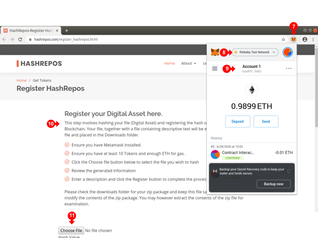 Once connected, click on the Metamask Fox icon (7) to bring up the wallet details. Make sure the Rinkeby Test Network is selected in (8), and the Account shown in (9) is the account you wish to use to register the Hash. This account will be recorded as the owner of the HashRepos registry item.