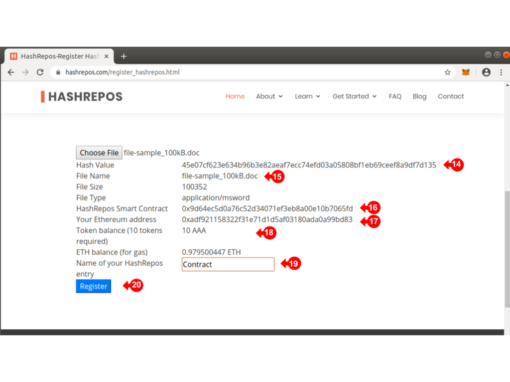 The HashRepos Smart Contract address (16) is listed for reference, as well as your Ethereum Address (17) which should be the same as the active Metamask Address.