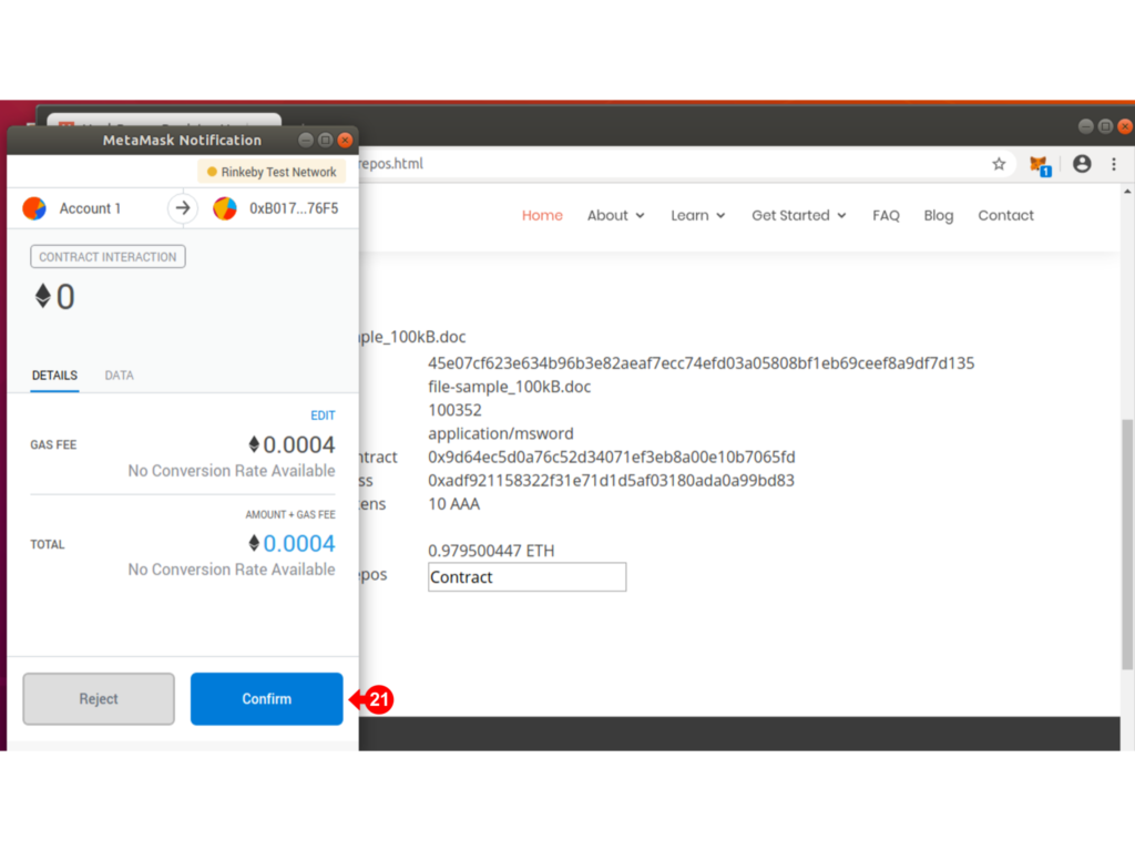 The Metamask Notification will pop up for you to confirm the transaction (21).