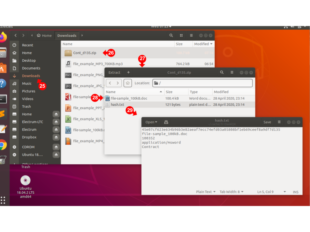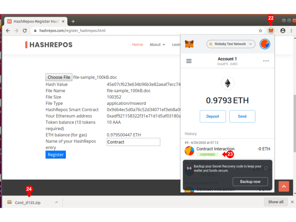 Note that a zip package (24) will be placed in the Downloads folder. The name of the zip file will be the first 4 characters of your file description combined with the last 4 characters of the hash. You should keep this package securely as it will also preserve a copy of your file.